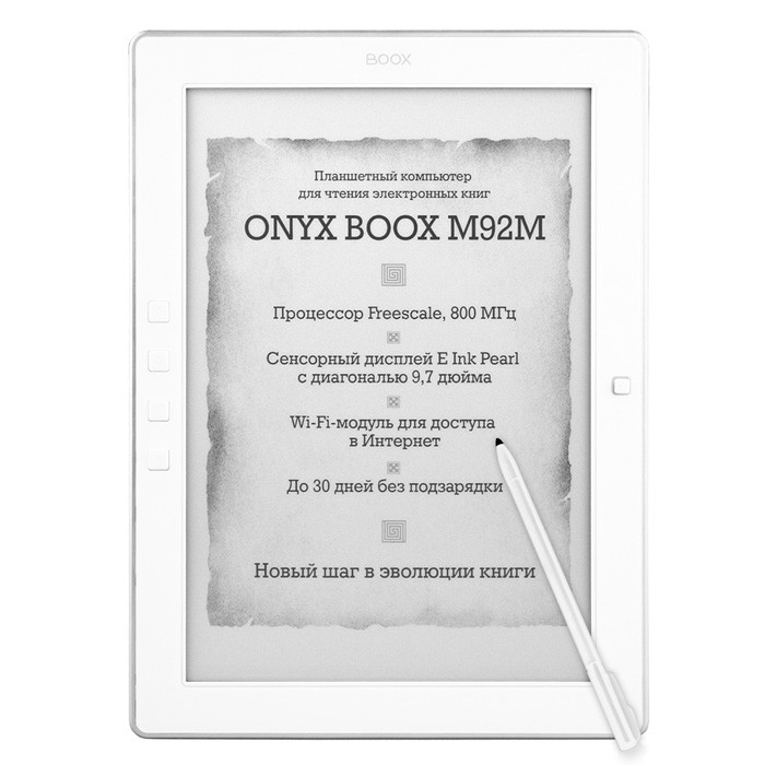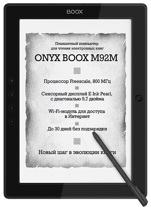 Средняя цена устройства - 14500 рублей. Onyx Boox M92M Perseus работает на процессоре Freescale I.MX 508, благодаря чему любые операции выполняются электронной книгой в кратчайшие сроки. Устройство поддерживает многие форматы книг: EPUB, XLSx, PDF, TXT, RTF, PPT, CBZ, FB2, DOC, ZIP, HTML, CHM, PPT, PPTX, DjVu, CB7. Теперь чтение доставляет вам удовольствие, ведь яркий 9,7-дюймовый дисплей завораживает насыщенностью цветов. Более того, устройство позволяет изменять размер и стиль шрифта, создавать закладки, регулировать масштаб документов.